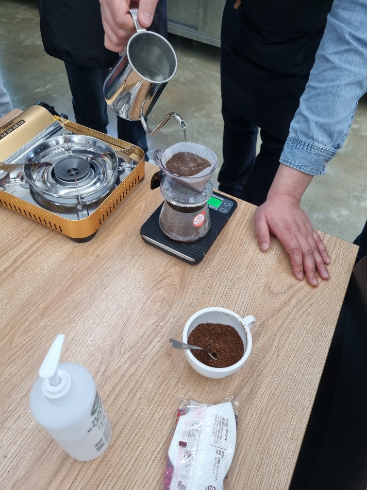 2주차부터는 본격적으로 머신을 운용하고 커피를 추출하는 방법에 대해 배우기 시작했는데요. 우리가 마시는 한모금의 커피가 되기까지 커피는 재배 - 수확 - 가공 - 로스팅 - 추출의 과정을 거칩니다. 재배, 수확, 가공은 한국에서 직접 해보기는 상당히 제한되기에 저희는 로스팅부터 시작을 해봤는데요. 가장 간단한 로스팅 방법은 커피 생두를 채망에 넣어 가스불에 천천히 올려가며 볶아주는 것입니다. 이때 중요한 점은 생두의 겉 부분이 타지 않도록 불에 스치듯이 볶아주면 됩니다. 로스팅을 잘 하고 있다면 6-7분 정도가 지난 후 탁탁 소리와 함께 1차 크랙이 발생하게 되고, 이후 11분이 되면 2차 크랙이 발생하는 소리가 납니다. 로스팅을 얼마나 해주느냐에 따라서 라이트, 시나몬, 미디움, 하이, 시티, 풀시티, 프렌치, 이탈리안의 단계로 로스팅이 완성되게 됩니다. 이때는 12-14분 정도 원두를 볶아서 풀시티 정도의 로스팅을 해주었고 이 원두를 그라인더로 갈아서 핸드드립을 해서 직접 마셔보았습니다. 로스팅 직후의 원두는 사실 가스가 많이 차있어서 커피를 추출하기에 적합하진 않지만 그래도 즐거운 경험이었네요~