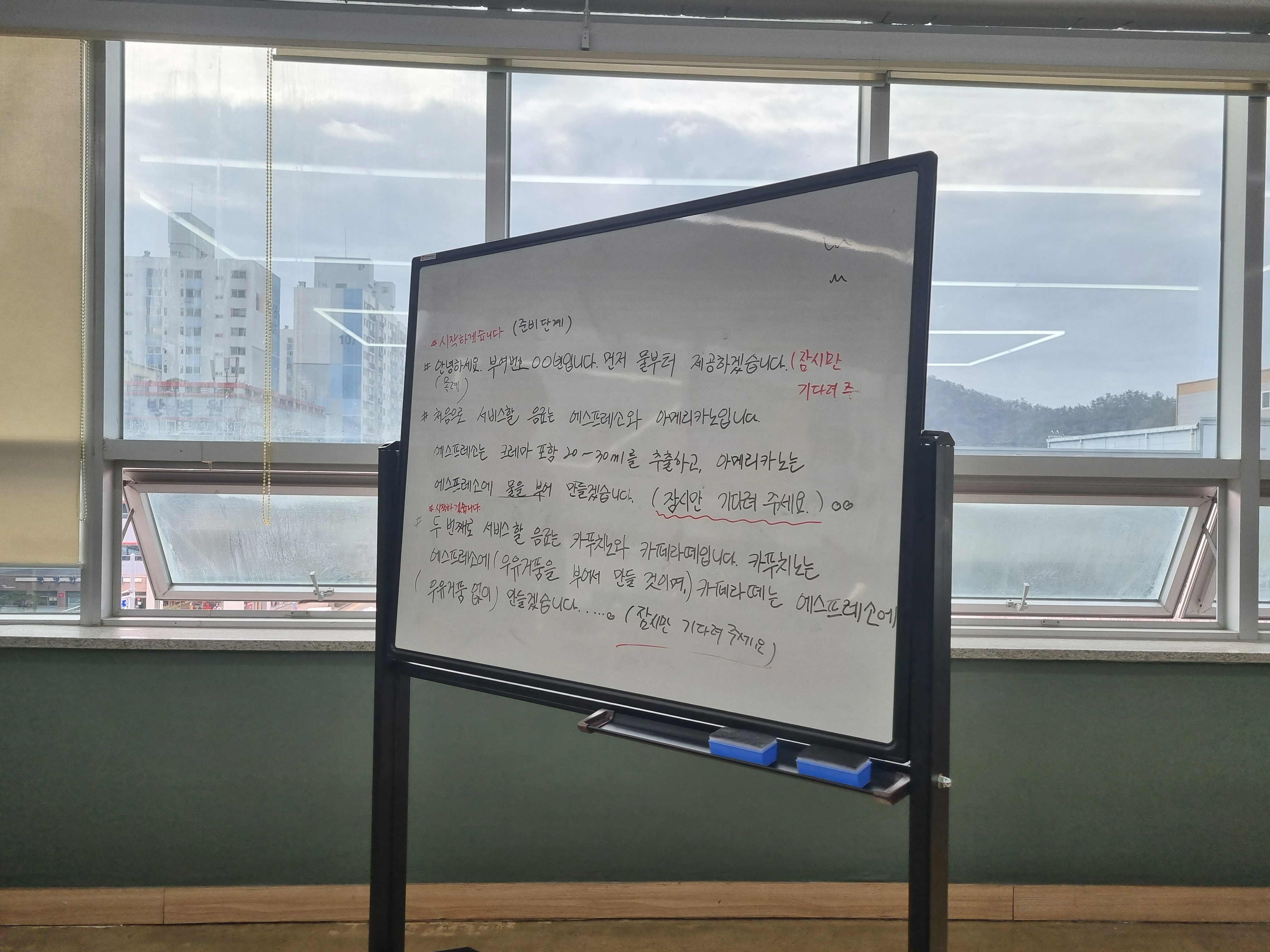 마지막 사진에 있는 대본이 실기때 저희가 암기해서 물과 아메리카노, 카푸치노, 라떼를 만들어 심사위원께 드리는 과정을 적어 놓은 건데요. 저거 두판 분량의 대본을 암기하고 자연스럽게 커피를 추출하면서 말을 해야하기 때문에 다들 처음에 부담스러워하고 어려워했습니다ㅜㅜ 저는 그런게 싫어서 집에 가자마자 대본부터 달달달 외운 후에 다음날 빡세게 실기 연습을 했던 기억이 있네요ㅎㅎ 근데 대부분은 처음에 너무 열심히 하지 않아도 강사님과 교육프로그램이 다들 능숙하게 하도록 알아서 만들어 줍니다~~~