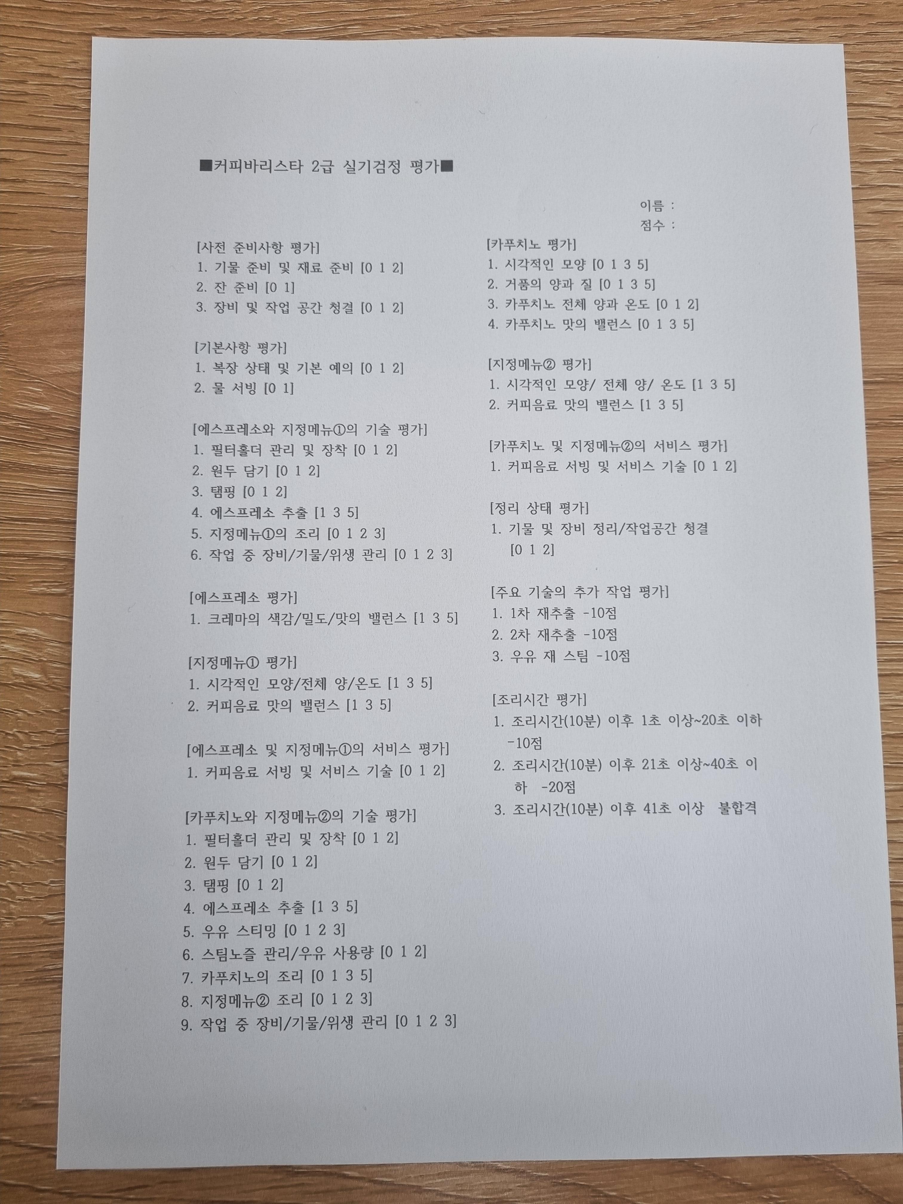 심사가 종료되면 심사위원께서 "정리하세요."라고 말씀하실거고 사용하였던 포터필터, 머신, 스팀피처, 샷 글라스, 잔, 린넨, 타월 등을 정리하여 원래 상태로 돌려놓으면 됩니다. 끝나면 "마치겠습니다."라고 이야기하고 퇴장하시면 시험은 마무리가 되고 정리된 모습까지 모두 심사를 마친 심사위원분들이 최종적으로 점수를 채점하게 됩니다.