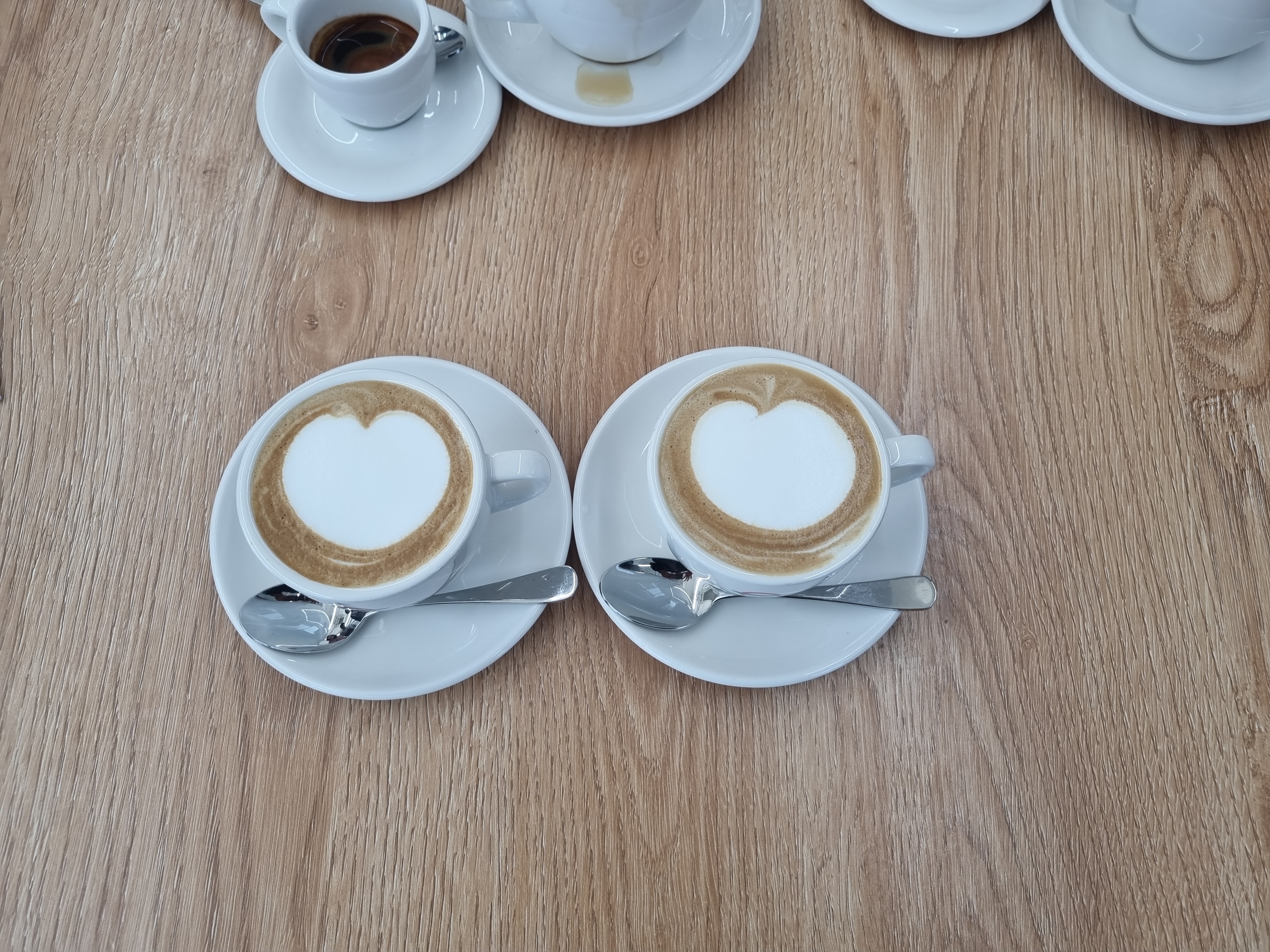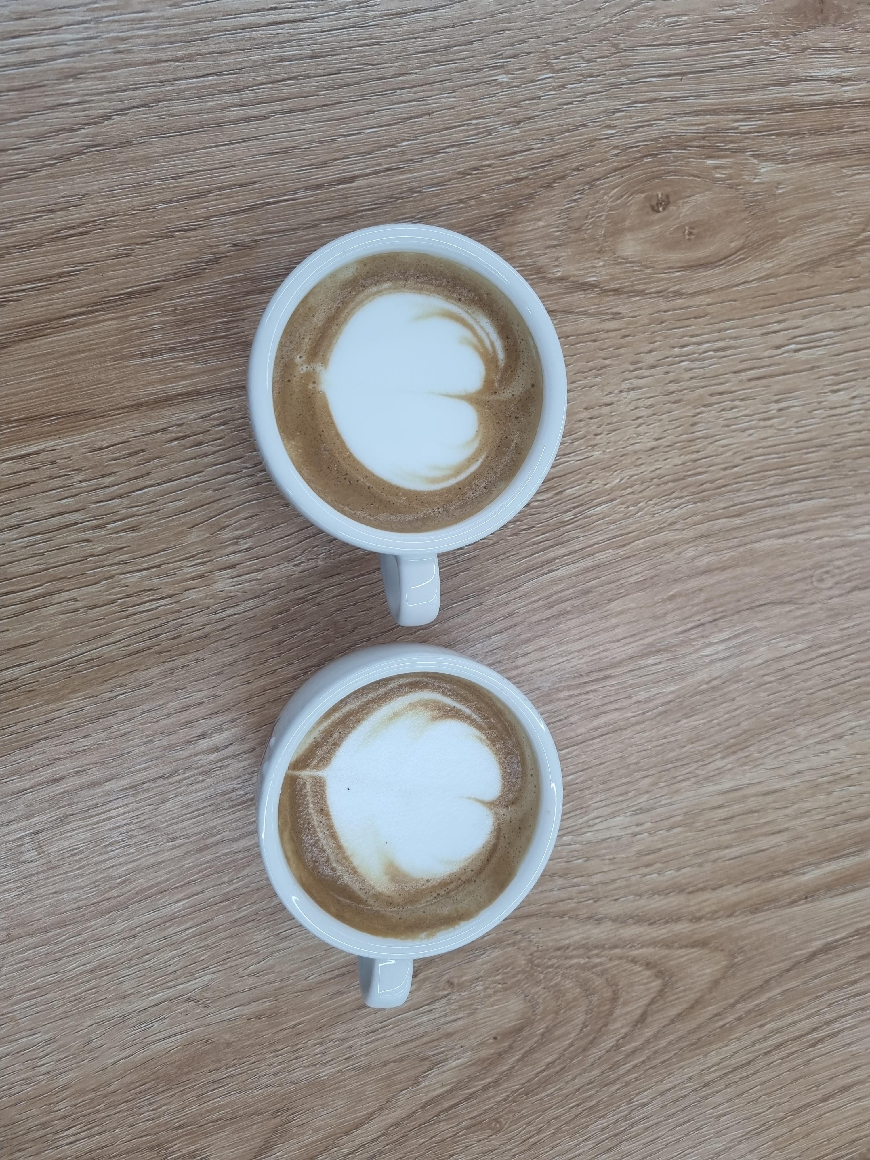 4주차에 들어서는 대부분의 수업시간을 실기시험 대비하는데 사용했는데요. 1명이 실기시험을 보는데 15분 정도가 소요돼서 2인 1조로 연습을 하고 강사님의 피드백을 듣고 나면 2시간이 훌쩍 흐르곤 했어요ㅎㅎ 하루에 한번 연습으로도 충분히 시험에 합격할 수 있지만 열정이 넘치는 저희반 수강생들은 수업 1시간 전부터 미리 와서 머신을 예열하고 연습을 했습니당ㅋㅋㅋ 열정이 너무 넘치다보니 처음엔 4명정도만 일찍 와서 연습하다가 점점 사람이 많아지더니 나중엔 자리경쟁이 되게 치열했죠...ㅠ 지금이야 하트를 띄우는게 정말 라떼아트의 기본중에 기본이다! 이건 해야한다! 라고 당당히 이야기할 수 있지만 그 당시엔 원 하나 올리는 것도 정말 어려웠어요 ㅋㅋㅋ 간단한 라떼 꿀팁을 알려드리자면 잔에 스팀피처를 가까이 붙이면 그림을 그리게되고 멀리 띄우게 되면 그림을 지우게 됩니다. 그렇다면 하트를 띄우기 위해서는??? 잔의 3분의 1 지점에 스팀피처를 붙여서 푸어링을 해주면 거품이 하얗게 띄워지면서 잔의 가장자리를 따라 동그랗게 말리는데요. 충분히 말려서 안쪽으로 들어온다 싶으면 이때 스팀피처를 뒤로 들어올린 후 하트가 되도록 왼쪽으로 쭉 그어주면 됩니다. 하트가 어려우신 분들은 참고하시길!!