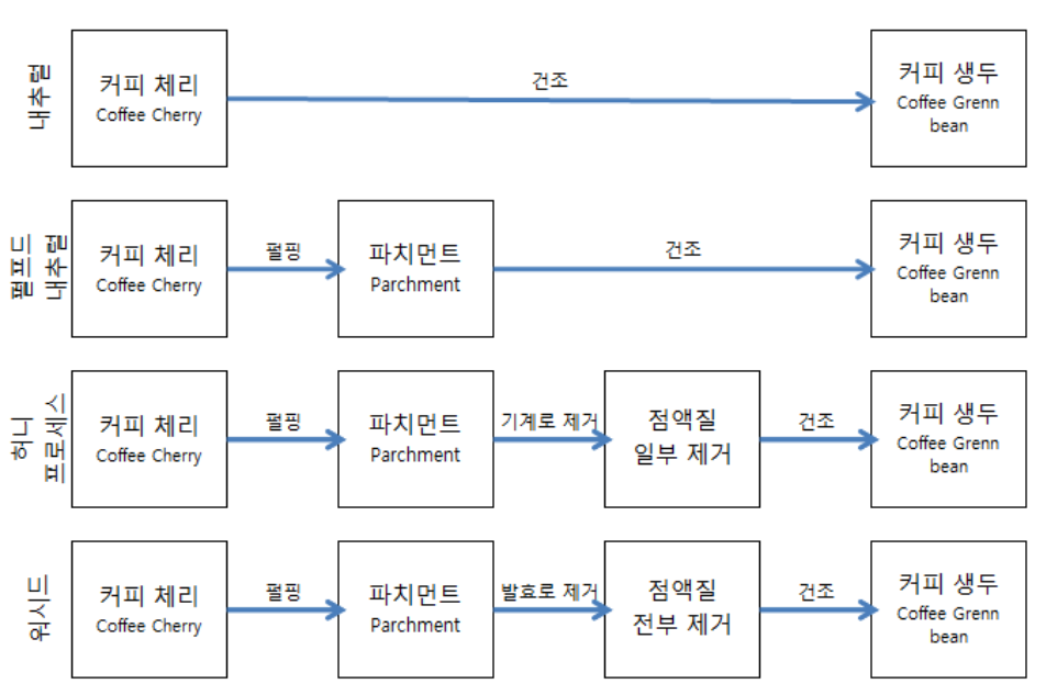 지난번 포스팅에서 커피체리의 구조에 대해 알아보았습니다. 우리가 자주 보던 커피원두와 커피체리는 생김새부터 확연한 차이가 있습니다. 커피체리가 우리가 아는 커피원두의 모양이 되기 위해서는 생두를 둘러싼 조직을 제거하는 가공이 필요합니다. 긴 커피의 역사만큼 지역별, 농장별로 사용하는 가공법이 다릅니다. 오늘은 커피를 가공할 때 어떤 지역에서 주로 어떤 방식의 가공법을 사용하는지와 각 가공법의 특징 그리고 차이점은 무엇인지 알아보도록 하겠습니다.