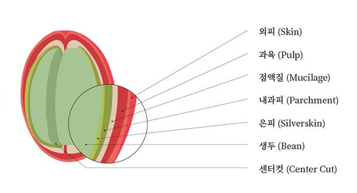 우리가 커피추출에 사용하는 짙은 색의 원두는 완전히 성장한 커피 체리를 가공하여 생두를 제외한 조직을 모두 제거한 뒤 로스팅을 거쳐 완성된 가공품입니다. 그렇다면 가공되기 전 커피 원두는 어떤 모습이었을까요? 오늘은 커피 체리의 구조에 대해 위의 그림과 함께 알아보도록 하겠습니다.
